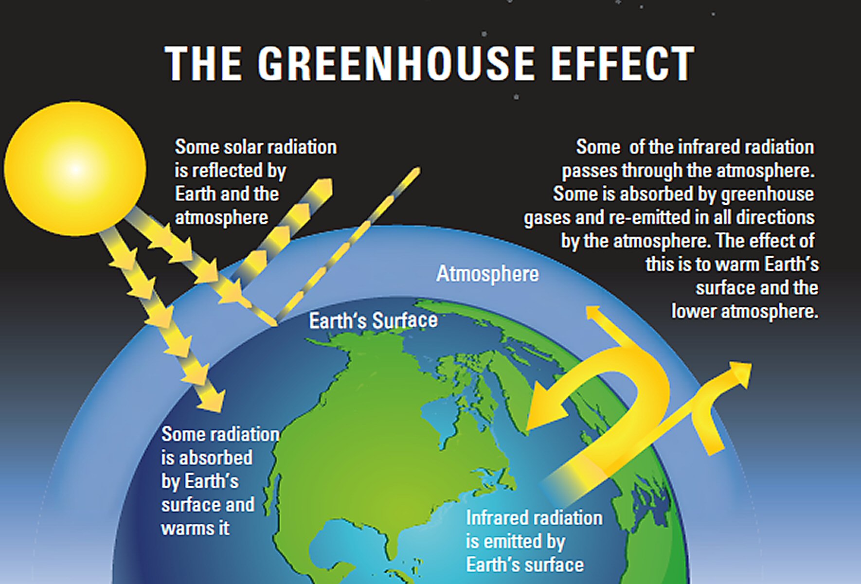 En pocas palabras, la teoría de Gas Invernadero funciona así: la luz solar atraviesa la atmósfera, al llegar la luz a la superficie esta es absorbida por elementos no reflectantes (tierra, mar) que a su vez la liberan como calor (radiación infrarroja), para luego ser atrapado por el CO2 y otros gases invernaderos.