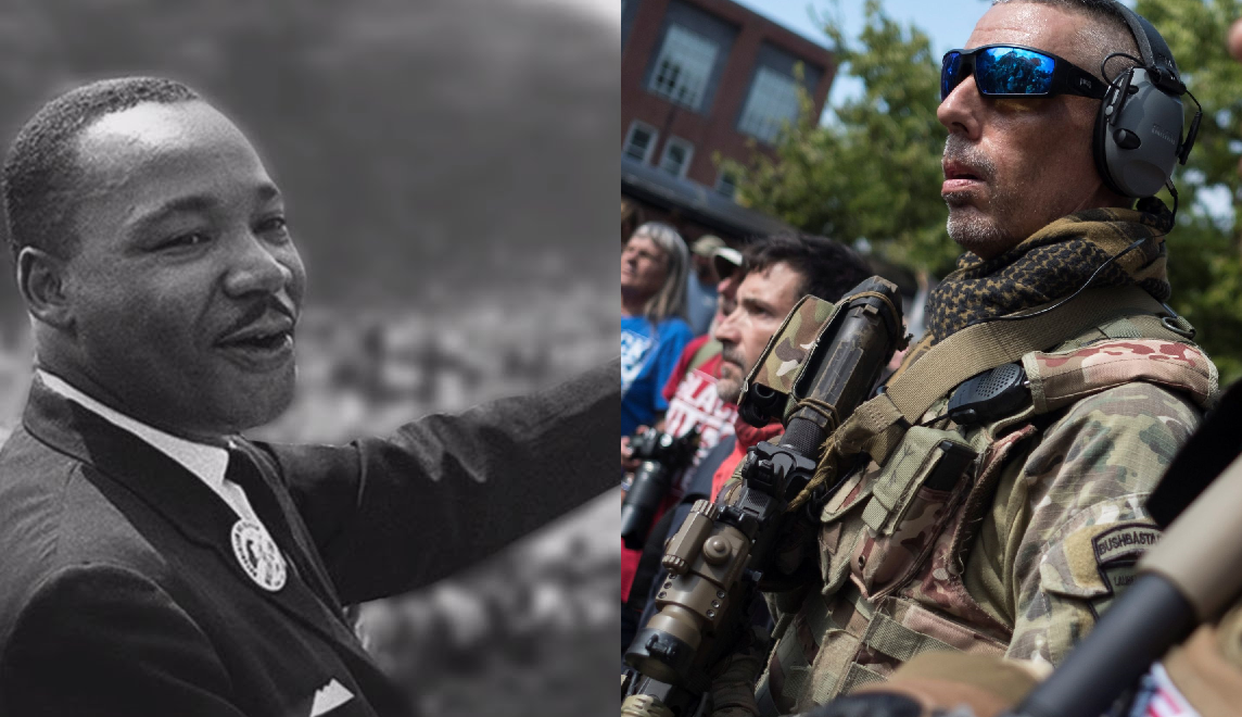 Hace pocas semanas, tras otro aniversario de Martin Luther King Jr, vuelve a ponerse en boga el éxito de su método de “No Violencia” para permitir que la minoría negra en EEUU alcanzara la plena ciudadanía, tal propuesta estaba fuertemente inspirada en las enseñanzas de Gandhi, para lograr la independencia de India. MLK organizaba multitudinarias marchas o sentadas donde los protestantes sin cometer acto de violencia alguno y soportando humillaciones y ataques de los contraprotestantes. Del éxito de sus marchas hoy se extrae la lección que las armas no son necesarias en nuestra sociedad democrática. ¿es efectivo que MLK proponía no tener armas?, ¿pensaba que las armas eran malas?